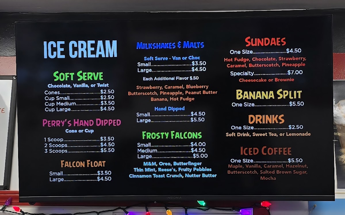 As an inviting ice cream shop as well, Falcon's Nest serves up classic sweet treats throughout the day. Hand-dipped shakes and specialty sundaes like the Frosty Falcon or Banana Split offer a comforting, nostalgic finish to any meal or a refreshing pause on their own.